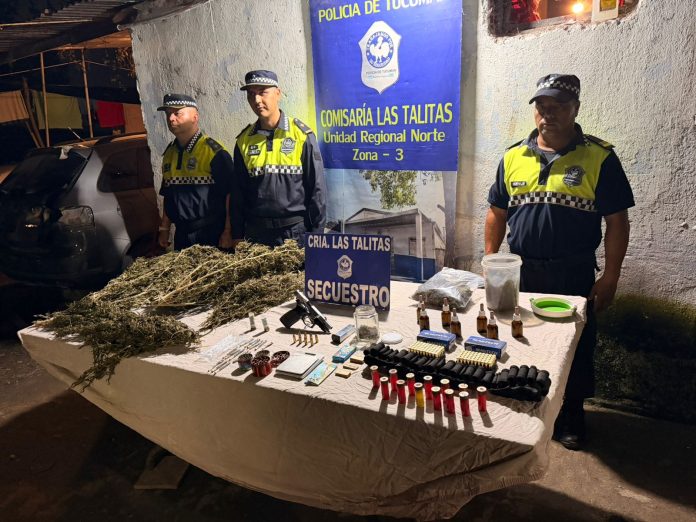 Secuestraron una pistola 9 milímetros con 108 municiones, una canana con trece cartuchos, una cantidad importante de marihuana discriminada en cogollos, en una bolsa, en cigarrillos, suelta en frascos de vidrio, plantas y frascos con aceite de cannabis; además, todo lo necesario para fraccionarla: dos “picachu”, cajas de papel engomado, balanza de precisión y filtros de cigarrillos, todo listo para comercializarla.