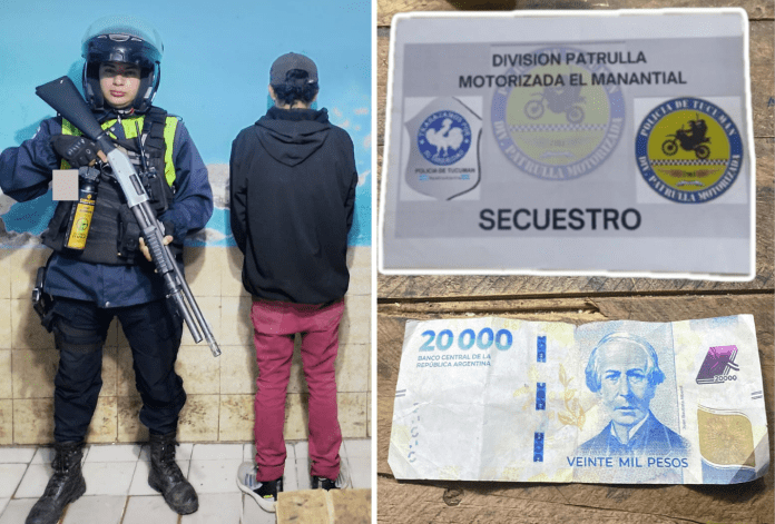 En circunstancias que los motoristas concretaban patrullajes preventivos, fueron interceptados por una mujer en la esquina de calles Cristo Rey y 25 de Mayo. La misma les habló de un hombre que, minutos antes, había ingresado a su negocio pidiendo que le cambiara un billete de $20.000 por billetes de menor denominación y ella se negó al darse cuenta que se trataba de dinero falso.