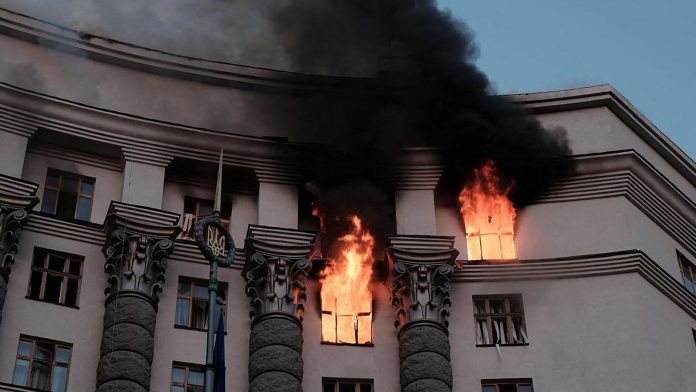 Las llamas se observaron en el techo del edificio donde se reúne el consejo de ministros. Columnas de humo se vieron en otros puntos de la capital ucraniana.