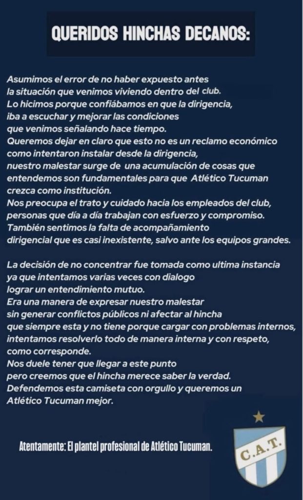 Tras la derrota ante San Lorenzo y la polémica reacción de Leandro Díaz en el estadio, el plantel profesional de Atlético Tucumán emitió un comunicado conjunto en sus cuentas de Instagram para aclarar el origen de su malestar. En el texto, titulado “Queridos hinchas decanos”, los jugadores aseguran que su reclamo no es económico, sino institucional, y apuntan a la falta de diálogo y acompañamiento por parte de la dirigencia.