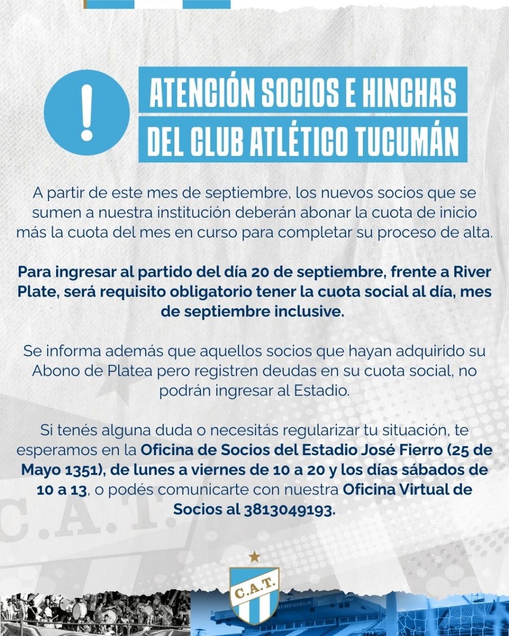 En el marco de su aniversario y con un calendario que incluye solo un partido de local —el esperado encuentro ante River Plate el sábado 20 de septiembre— Atlético Tucumán anunció nuevas disposiciones para quienes deseen asociarse al club a partir de este mes.