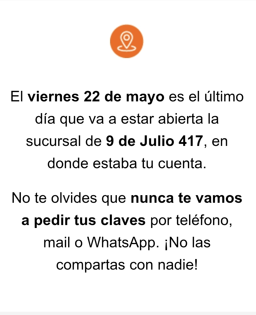 Algunos clientes de la entidad ya comenzaron a recibir comunicaciones oficiales donde se les informa la fecha de cese de actividades y el destino de sus cuentas. Según las notificaciones enviadas, se establece, por ejemplo, que el viernes 22 de mayo será el último día de atención en la sucursal de 9 de Julio 417. En estos mensajes, el banco aclara a los usuarios que sus cuentas serán trasladadas a otras sedes para garantizar la continuidad del servicio.