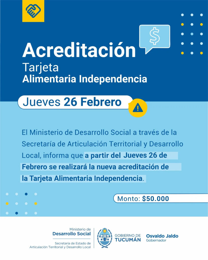 El Ministerio de Desarrollo Social de Tucumán informó que a partir del jueves 26 de febrero se realizará la nueva acreditación de la Tarjeta Alimentaria Independencia, un beneficio destinado a asistir a familias en situación de vulnerabilidad.