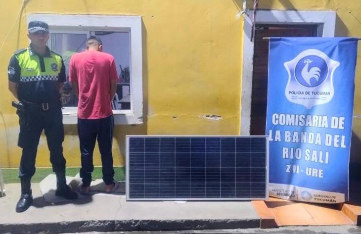 En la mañana de este jueves, un equipo de la Comisaría Banda del Río Salí en conjunto con los Vigías Municipales de esta localidad aprehendió al ladrón que junto a sus cómplices robaron un panel solar de la escuela Secundaria Barrio Aeropuerto. Tras las tareas investigativas lograron atrapar al delincuente cuando caminaba por la zona con el elemento robado.