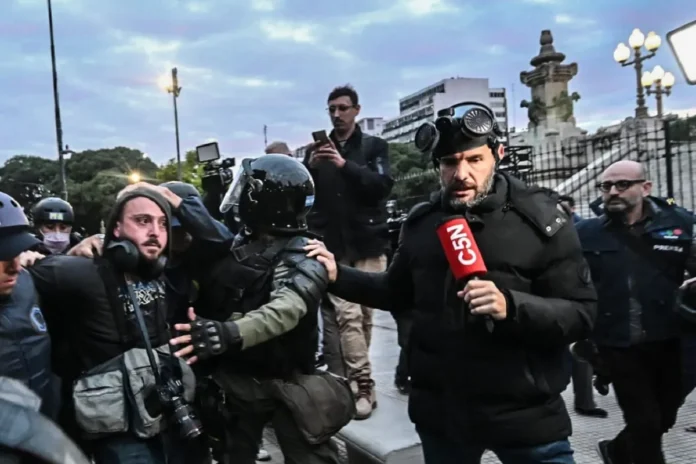 La represión afectó también a un equipo de LN+, que fue golpeado por efectivos de Prefectura mientras transmitían en vivo. El cronista Pablo Corso y el camarógrafo Diego Pérez Mendoza cayeron al suelo tras recibir un impacto de escudo. La transmisión fue interrumpida abruptamente.