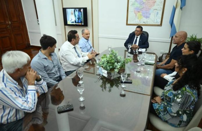 El ministro del Interior, Darío Monteros, recibió en Casa de Gobierno a los empresarios Miguel Tarascio y Jorge Capozucco, quienes donaron 5.500 kilos de carne y 3.000 módulos alimentarios destinados a La Madrid, una de las localidades más afectadas por las inundaciones de mediados de marzo. Participaron también Juan Carlos Bernard, subsecretario de Comercio Interior; y Miguel Vázquez y Mónica González, secretario Coordinador y directora de Desarrollo Social del Ministerio de Interior.