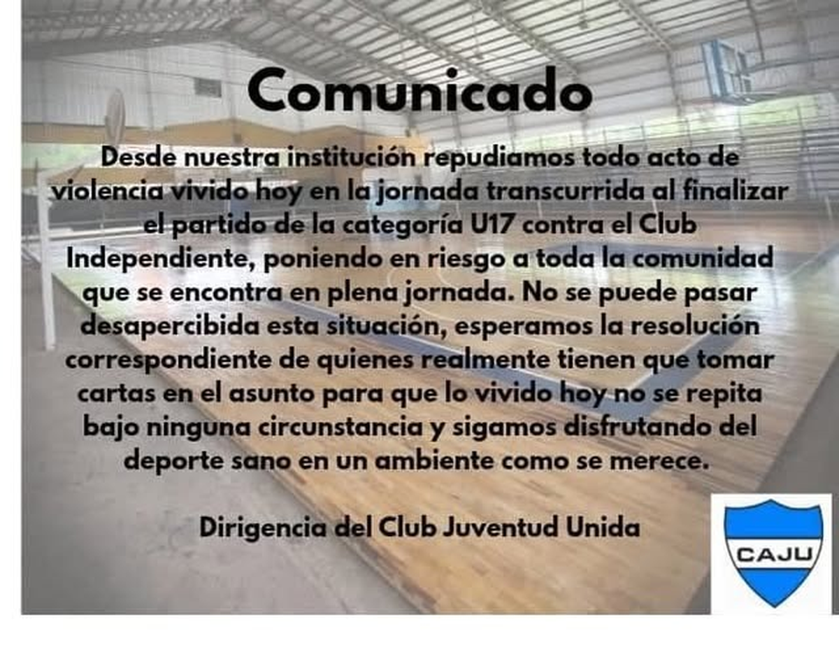 A través de un comunicado oficial, la dirigencia de Juventud Unida expresó su repudio por lo ocurrido y advirtió: «No se puede pasar desapercibida esta situación». Además, remarcaron que el accionar del involucrado «puso en riesgo a toda la comunidad presente» durante la jornada deportiva.