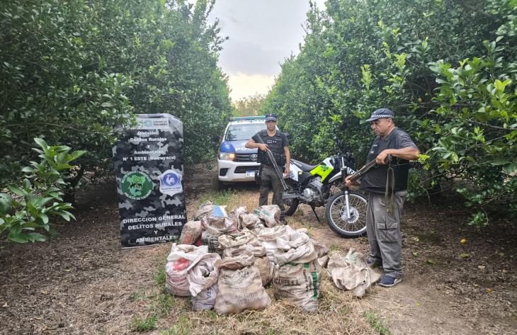 Al realizar un relevamiento en la finca, los efectivos hallaron debajo de las plantas los 30 kilos de limones que iban a llevarse y unas 100 bolsas arpilleras preparadas para el robo de más citrus.