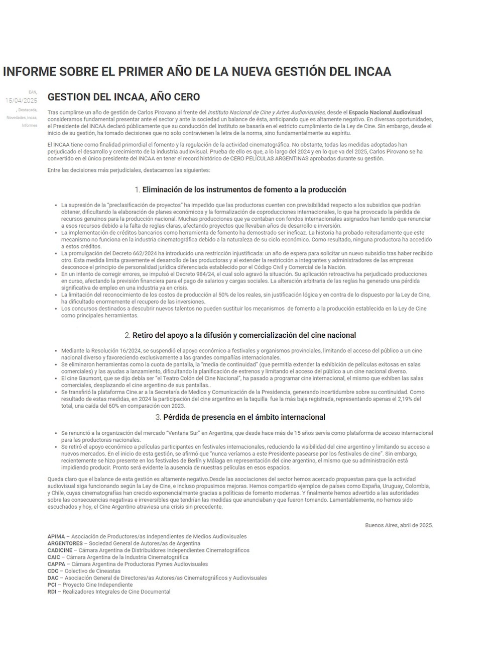En el documento difundido por el EAN, se denunció que “ninguna película argentina fue aprobada” durante 2024 y lo que va del 2025, lo cual marcaría un récord histórico de inactividad del INCAA. Además, se advirtió que todas las medidas implementadas habrían perjudicado el desarrollo de la industria.
