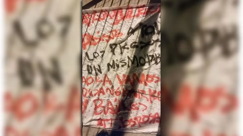 Escrito en aerosol rojo y negro, con varios errores de ortografía, el mensaje decía: