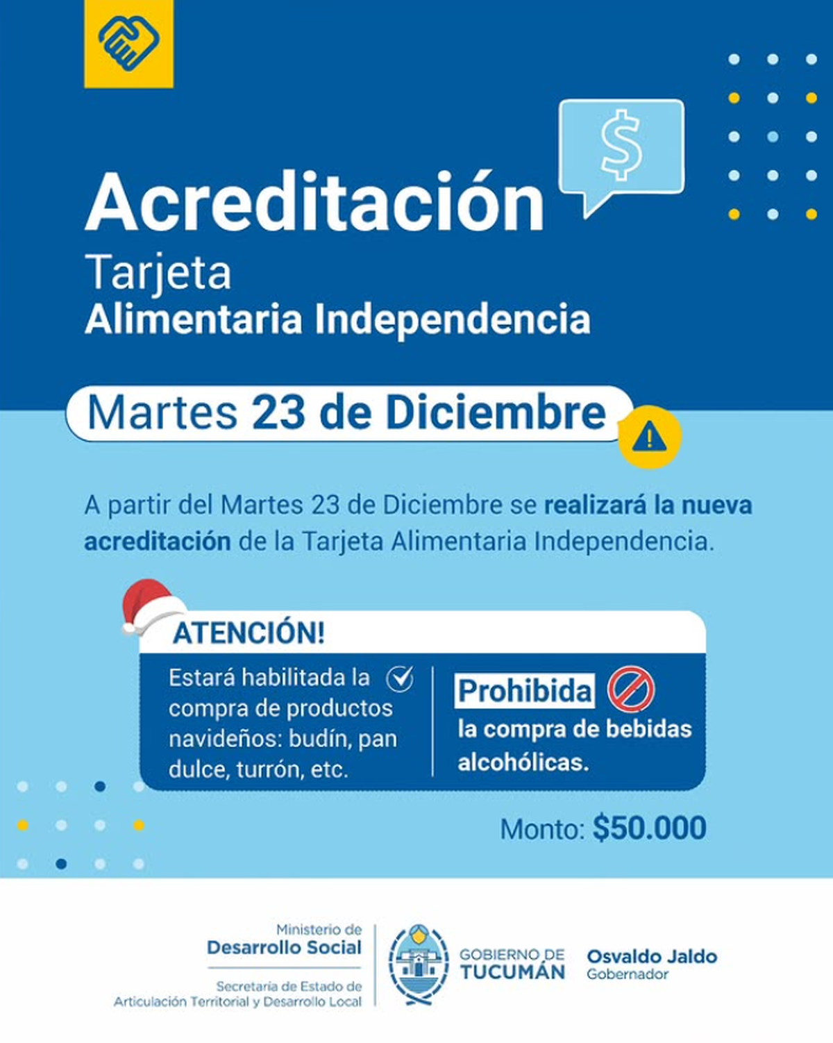 Desde el Ministerio de Desarrollo Social de la provincia de Tucumán, que conduce Federico Masso, informaron que a partir hoy martes se produce una nueva acreditación de la Tarjeta Alimentaria Independencia (TAI) por un monto de 50 mil pesos.