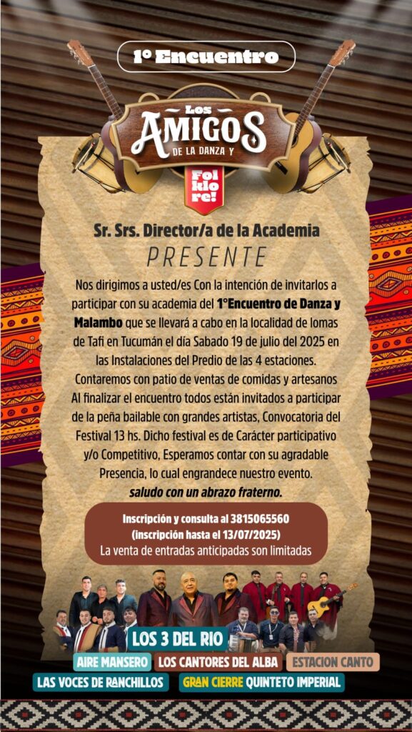 Con entrada libre y un espíritu festivo, este Primer Encuentro de Academias de Danzas y Folklore se perfila como uno de los grandes eventos culturales del invierno tucumano. Una verdadera fiesta popular que celebra nuestras raíces, talentos y tradiciones.