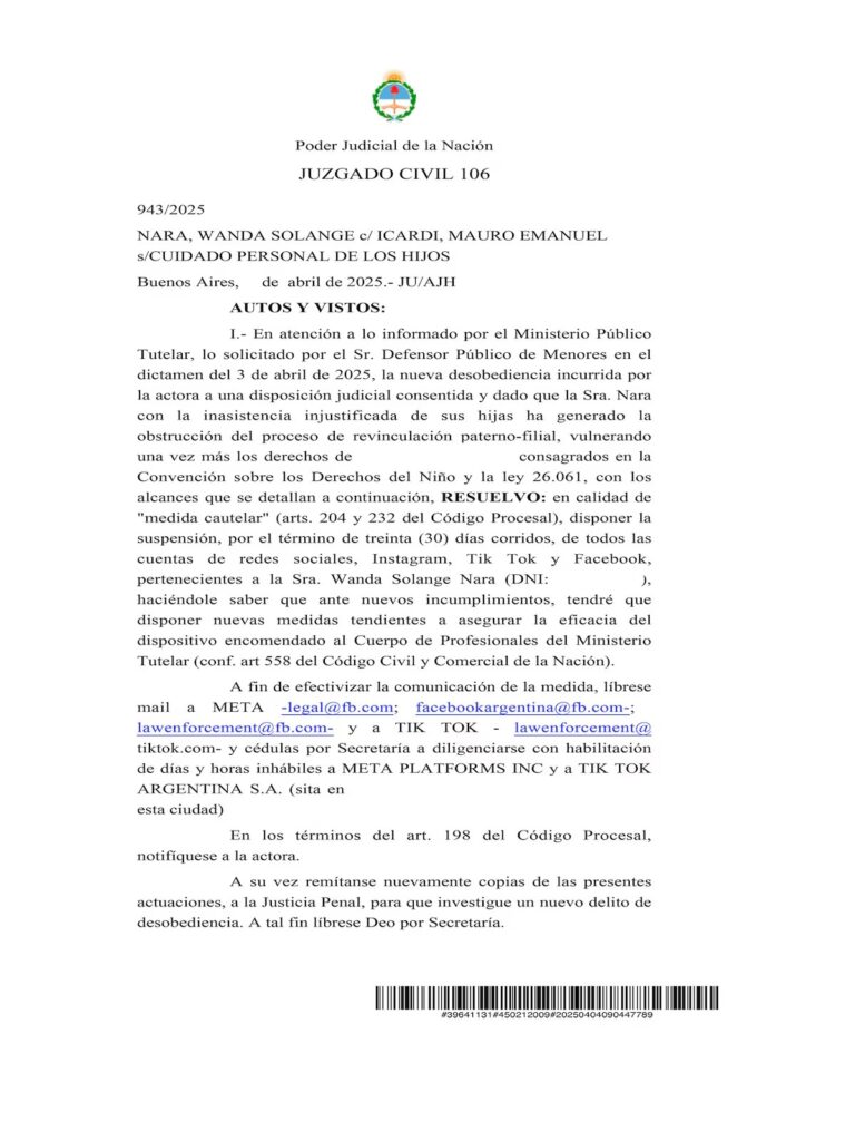 El documento judicial, fechado el 4 de abril de 2025, señala que la actora (Wanda Nara) incurrió en una nueva desobediencia a una orden judicial previamente consentida, al no garantizar la concurrencia de sus hijas a una instancia de revinculación con su padre, Mauro Icardi.