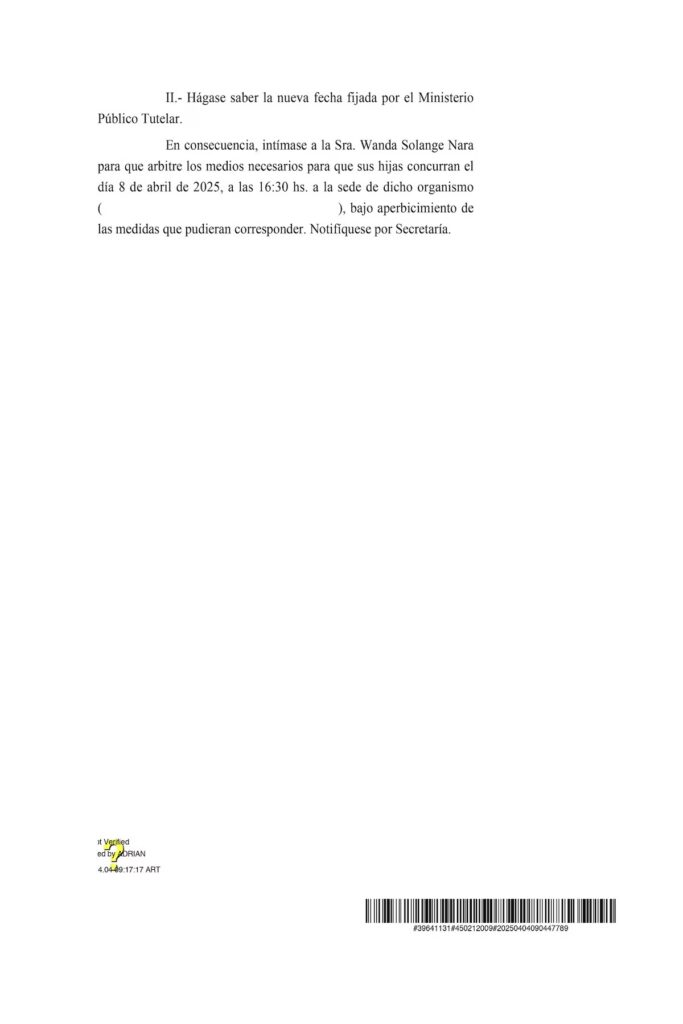 Respecto a la revinculación de Icardi con sus hijas, el tribunal intimó aWanda a garantizar la concurrencia de las niñas a una nueva audiencia programada por el Ministerio Público Tutelar el 8 de abril de 2025 a las 16:30 horas, bajo apercibimiento de adoptar nuevas medidas.