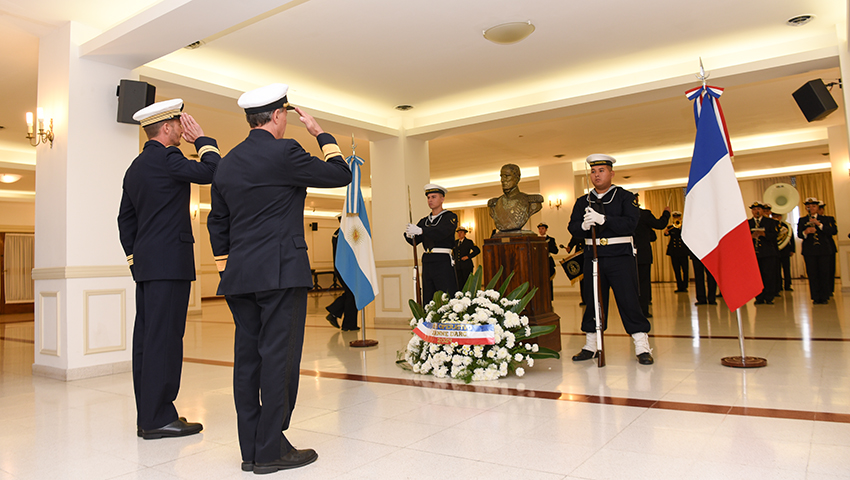 Marinos franceses del buque portahelicópteros anfibio “Tonnerre” y la fragata “Guépratte” recordaron al máximo prócer naval argentino.