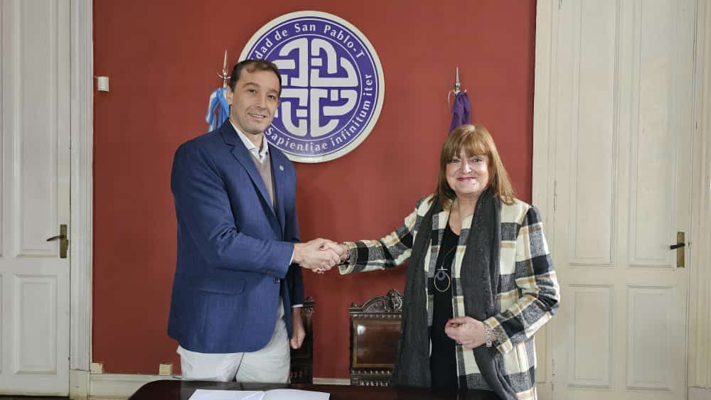 El vicerrector de la Universidad de San Pablo T, Arq. Matías Rohmer Litzmann recibió en el campus universitario en San Pablo a la decana de la Facultad de Agronomía, Zootecnia y Veterinaria de la UNT, Ing. Agr. Susana del Valle Montserrat para firmar entre ambas instituciones un acuerdo de cooperación. Del encuentro también participaron el director del Centro Integral de Biotecnología Aplicada (CIBA), Dr. Federico Pérez Zamora; la docente de la USPT, Marcela Colombo y el secretario de Gestión y Vinculación de la Facultad, Ing. Agr. Pedro Jorge Mario Vidal.