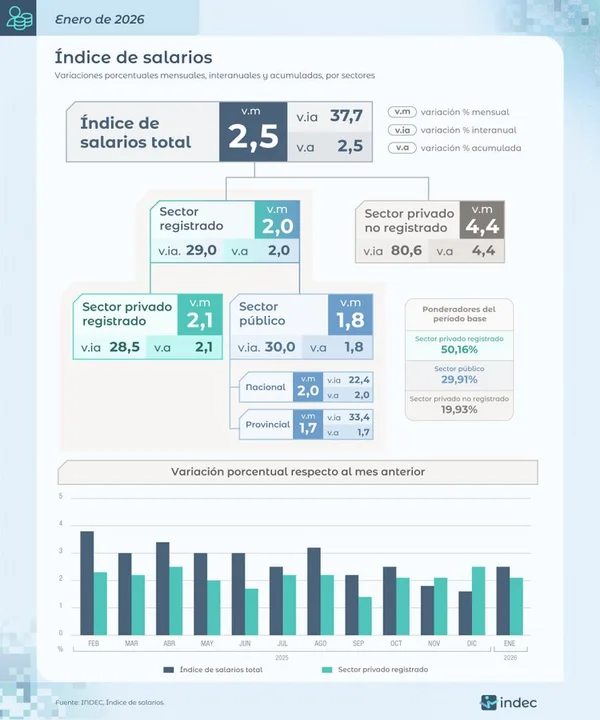 El sector registrado (que junta al privado y al público) aumentó un 2% en el primer mes del 2026, y registra su quinto mes consecutivo por debajo de la inflación (desde septiembre del último año).