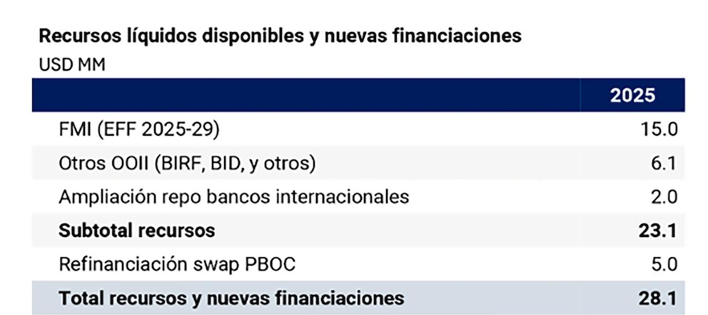 El programa contará con respaldo internacional. En el marco del nuevo acuerdo con el FMI, Argentina recibirá USD 20.000 millones, de los cuales USD 15.000 millones serán desembolsos de libre disponibilidad durante 2025. A ello se sumarán USD 6.100 millones de organismos internacionales y una nueva licitación de crédito repo por hasta USD 2.000 millones. Además, se renovó por un año el tramo activado del swap de monedas con el Banco Central de China por unos USD 5.000 millones.