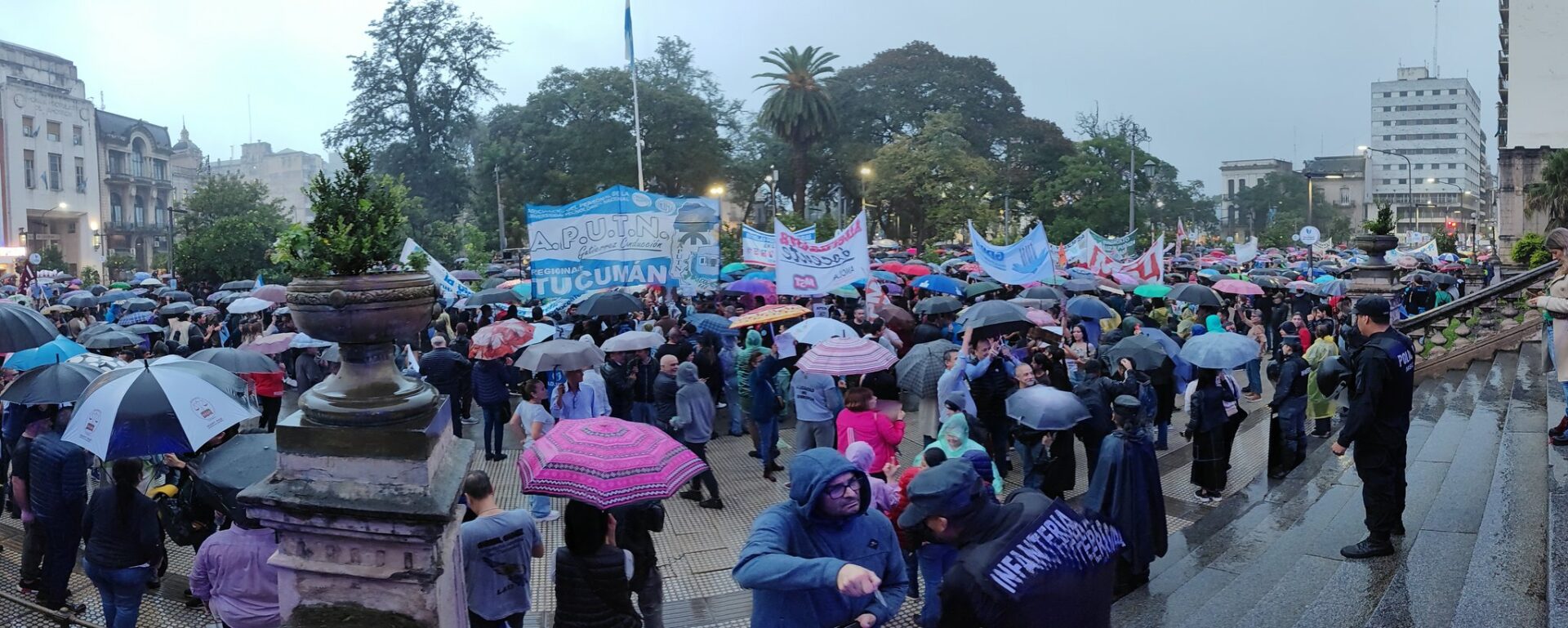 Tras los abrazos simbólicos al Rectorado de la Universidad Nacional de Tucumán (UNT) y la Universidad Tecnológica Nacional (UTN), bajo una persistente lluvia, la marcha ya se encuentra plaza Independencia, que en gran número, como en todo el país, protesta en defensa de la Universidad Pública, tras los recortes presupuestarios del Gobierno Nacional.