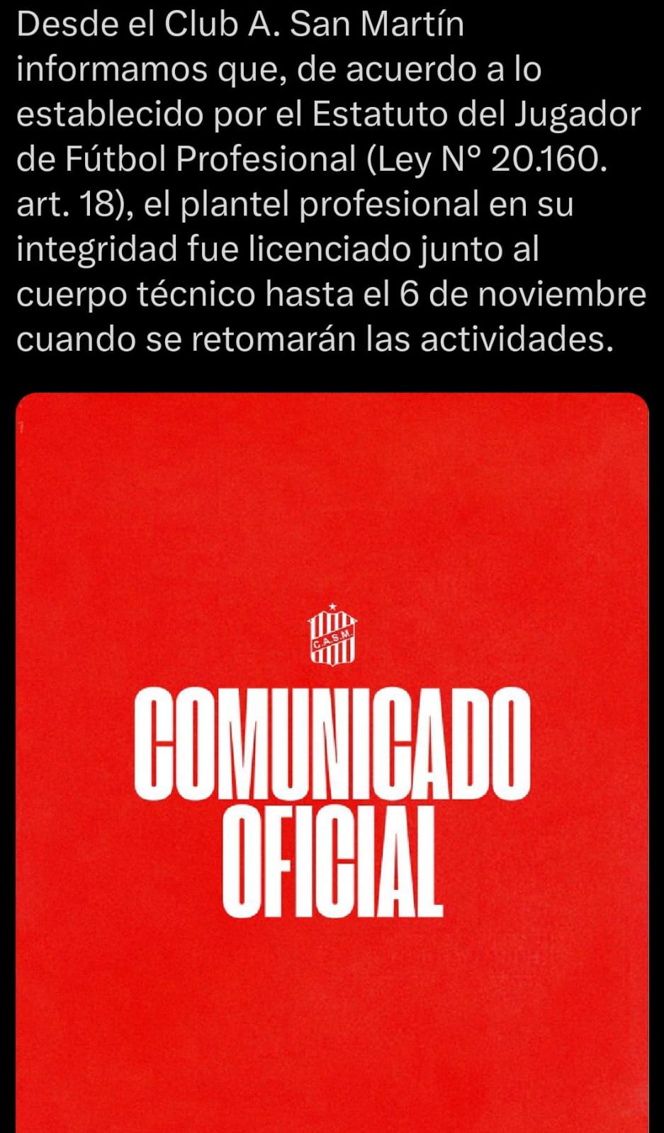 La Comisión Directiva del Club Atlético San Martín, aún en funciones, informó a través de sus canales oficiales que el plantel profesional y el cuerpo técnico han sido licenciados hasta el 6 de noviembre. La medida se enmarca en lo establecido por el Estatuto del Jugador de Fútbol Profesional (Ley N° 20.160, artículo 18), que regula los períodos de descanso para los futbolistas.