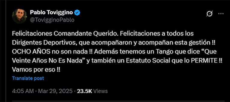 “Felicitaciones Comandante Querido. Felicitaciones a todos los Dirigentes Deportivos, que acompañaron y acompañan esta gestión !! OCHO AÑOS no son nada !! Además tenemos un Tango que dice “Que Veinte Años No Es Nada” y también un Estatuto Social que lo PERMITE !! Vamos por eso!!”, fue el mensaje en la red social X de Toviggino, actual tesorero de la AFA, mano derecha del Chiqui Tapia y uno de los hombres más fuertes en el ámbito doméstico.