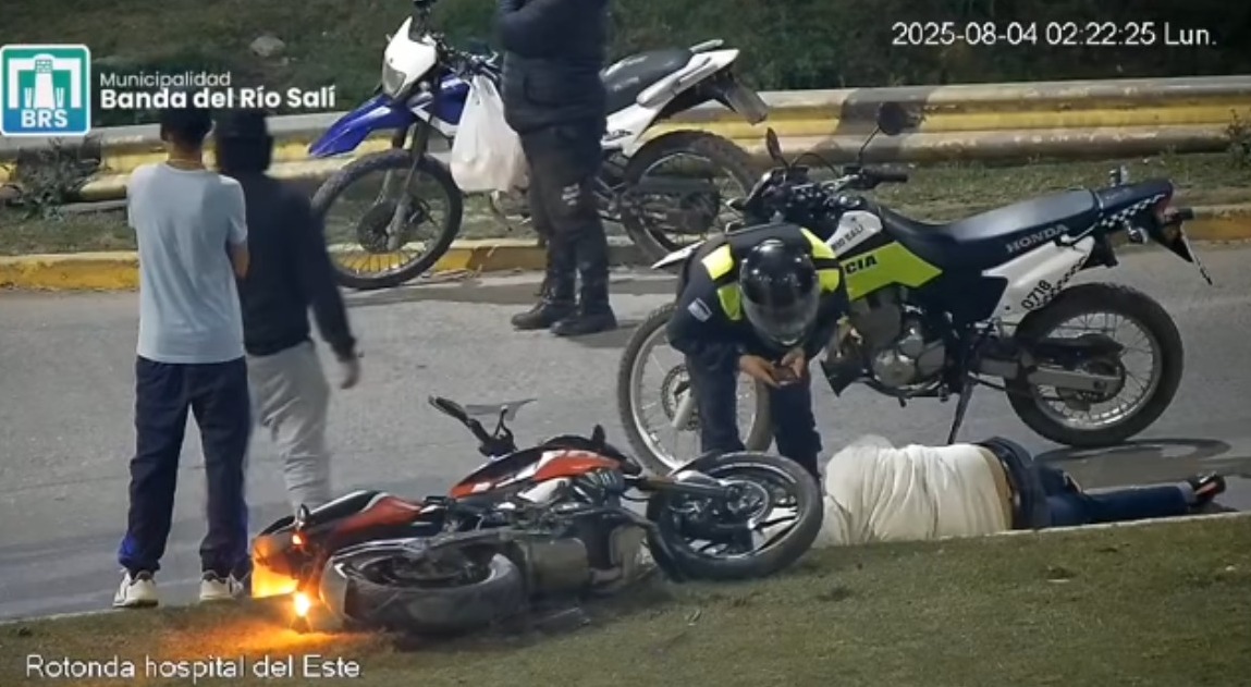 Un violento accidente de tránsito quedó registrado en la madrugada de este lunes por las cámaras del Centro de Monitoreo Municipal de Banda del Río Salí. Las imágenes muestran el momento exacto en que un motociclista, que circulaba a gran velocidad, pierde el control y se estrella contra el cordón de la vereda en la rotonda del Hospital del Este, alrededor de las 4 de la mañana.