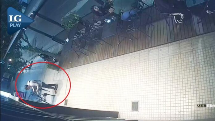 En las imágenes se observa cómo el sujeto separa dos sillas, las agrupa y luego se las lleva caminando como si fueran de su propiedad. En una de las oportunidades, incluso había clientes sentados en la vereda.
